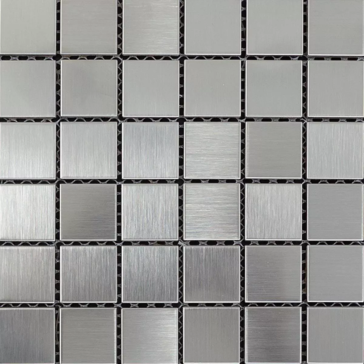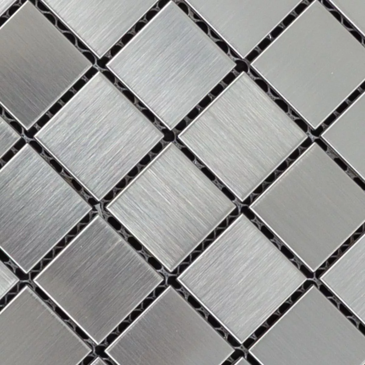 The square mosaic tiles have a total size of 29.8x29.8cm, while the individual stones have a generous format of 48x48mm. The brushed and shiny surface creates an impressive metallic look in a timeless silver color that reflects light and enhances any room.