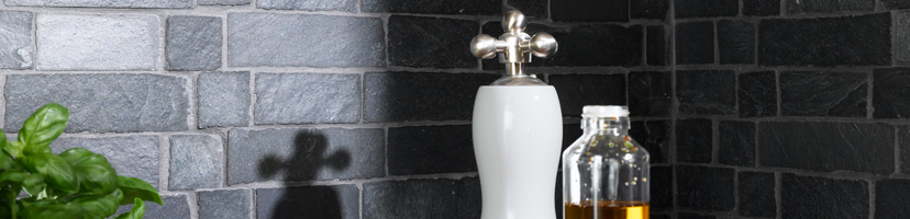 Even doors and frames can be covered with shallow slate. With slate in all colors, from dark gray to light tones, homeowners get a piece of natural warmth into the house. Even kitchenettes become a homely highlight with these tiles.