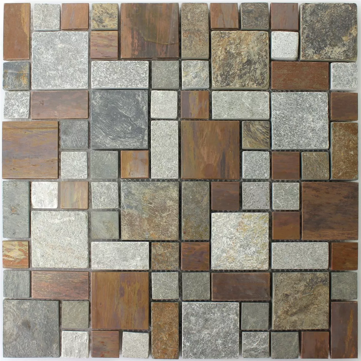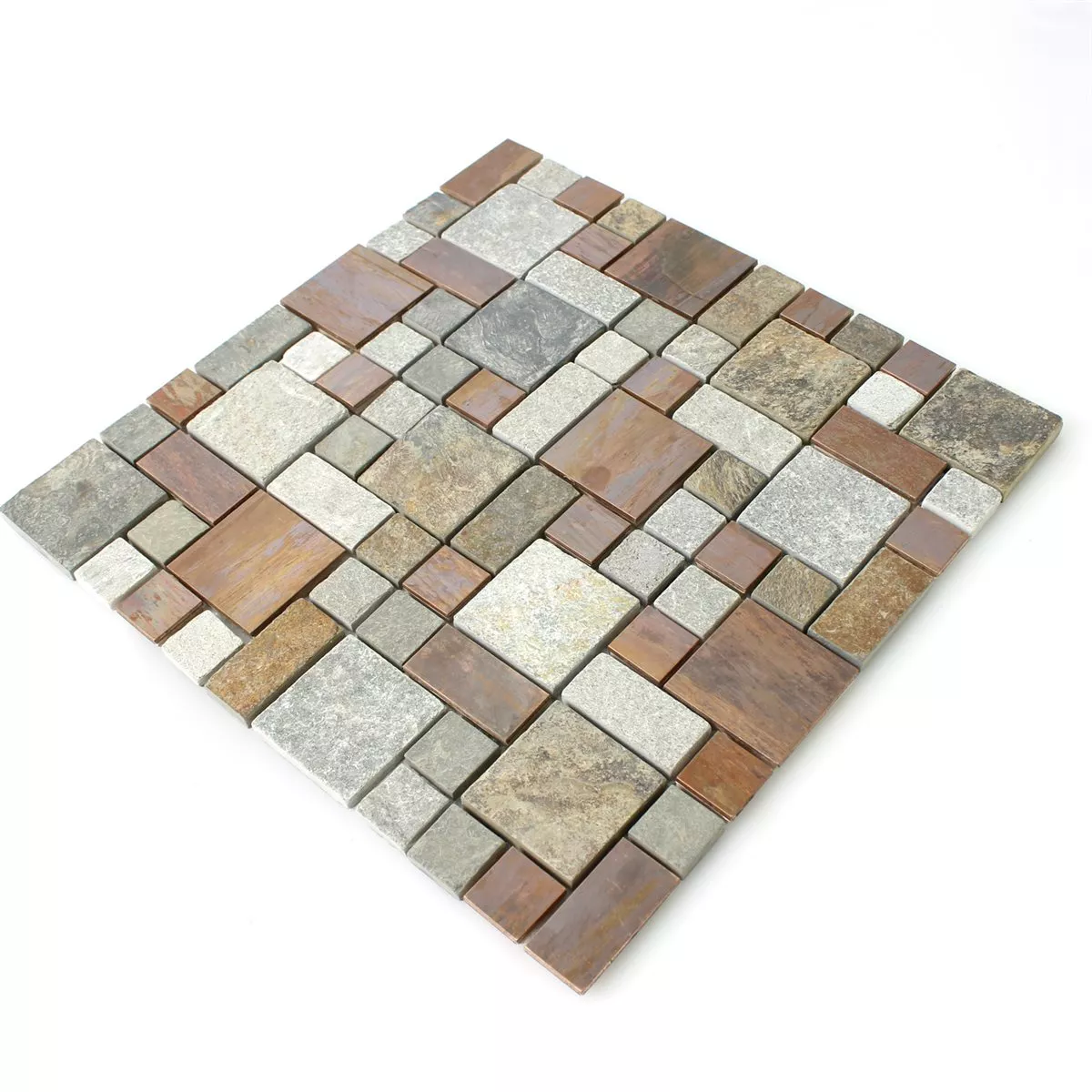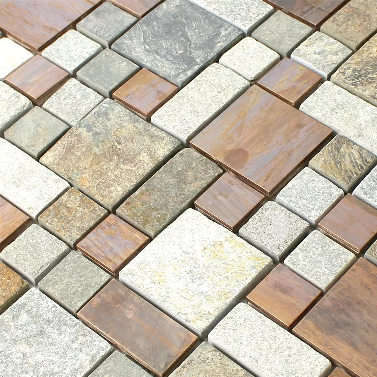 The Istanbul mosaic tile combines warm beige, brown, grey and copper tones with a touch of rust, creating a sophisticated yet rustic atmosphere. The mix of natural stone, metal and copper gives the tile a special look and an interesting feel.
