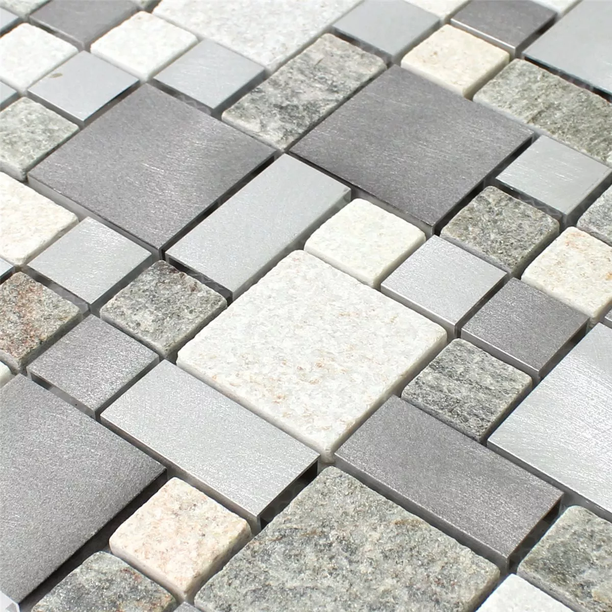 Made from natural stone, glass, metal and aluminum, this mosaic tile impresses with a varied surface structure made up of matt and brushed elements. This creates a noble, yet subtle look with a fascinating play of light.