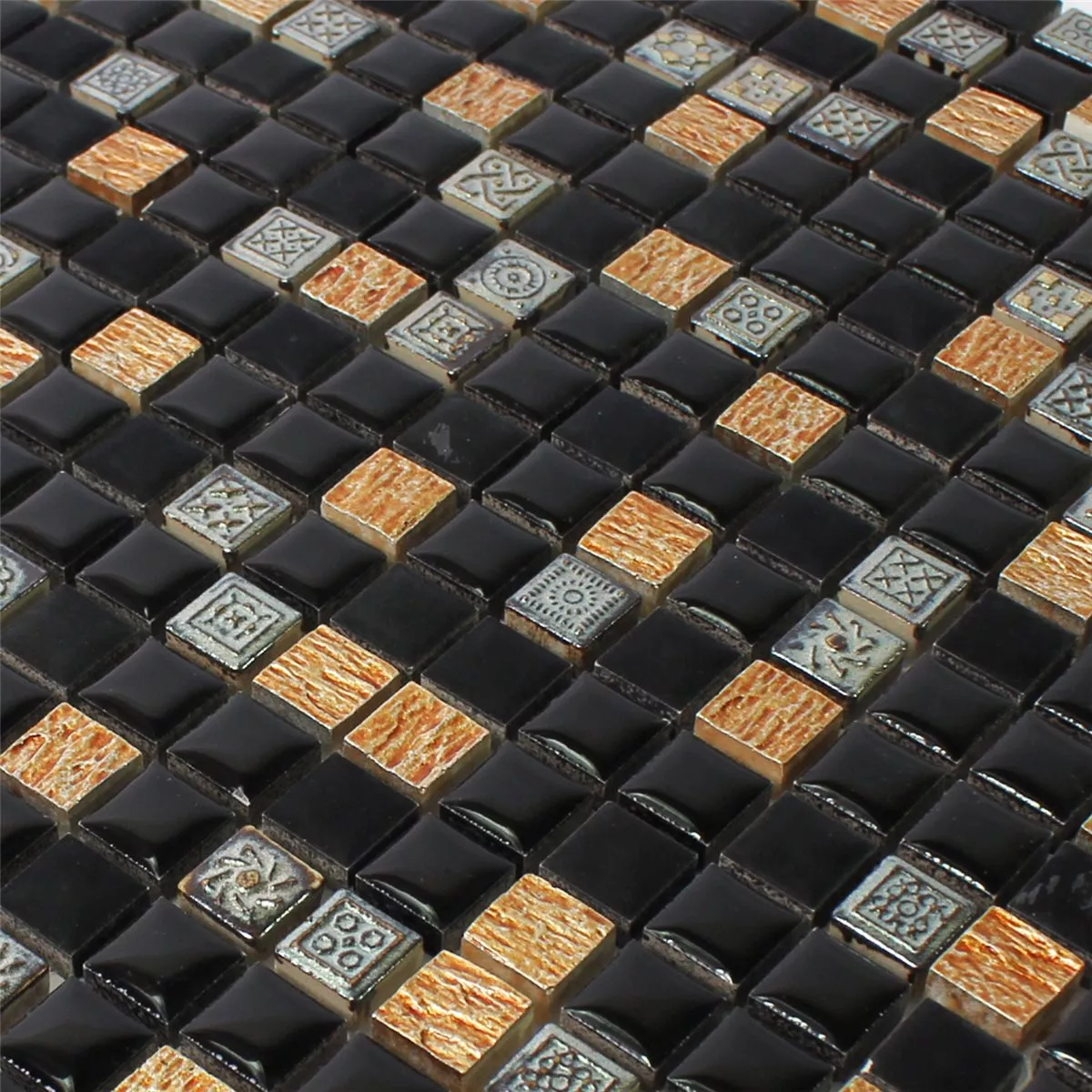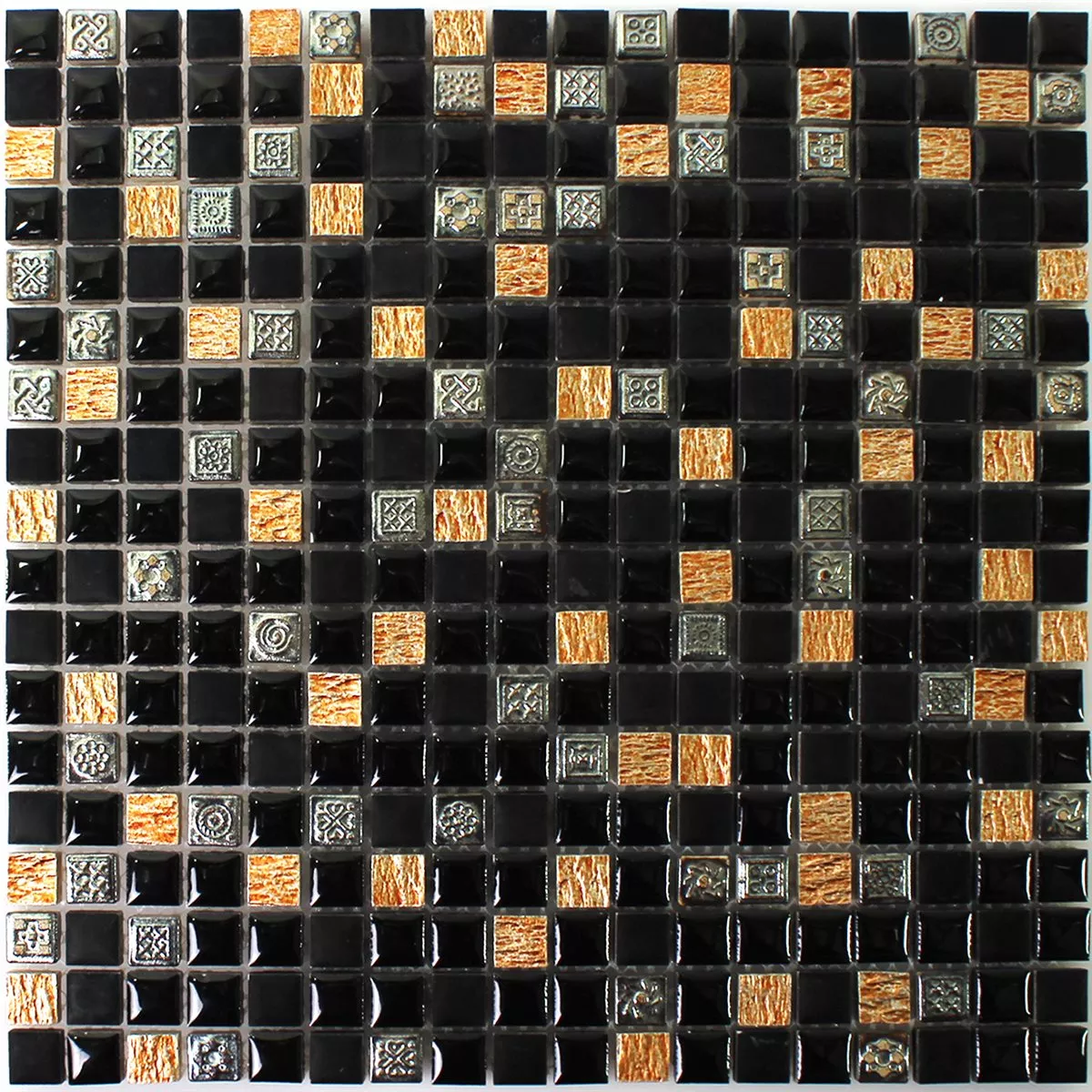 Made from high-quality natural stone and resin, the tiles impress with a varied matt, glossy and structured surface. This gives the mosaic tiles a special depth and a unique play of light. The square tiles in the format 30.5 × 30.5 cm are made up of fine 15 × 15 mm mosaic stones that are fixed to a net ready for installation. This enables simple and precise installation.
