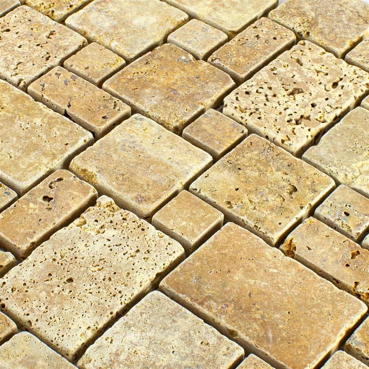 The LaGrange mosaic tile in luxurious gold made from fine travertine adds brilliant accents to any room. This exquisite natural stone tile combines a matte, tumbled surface with exceptional functionality to add an elegant and stylish touch to both walls and floors.
