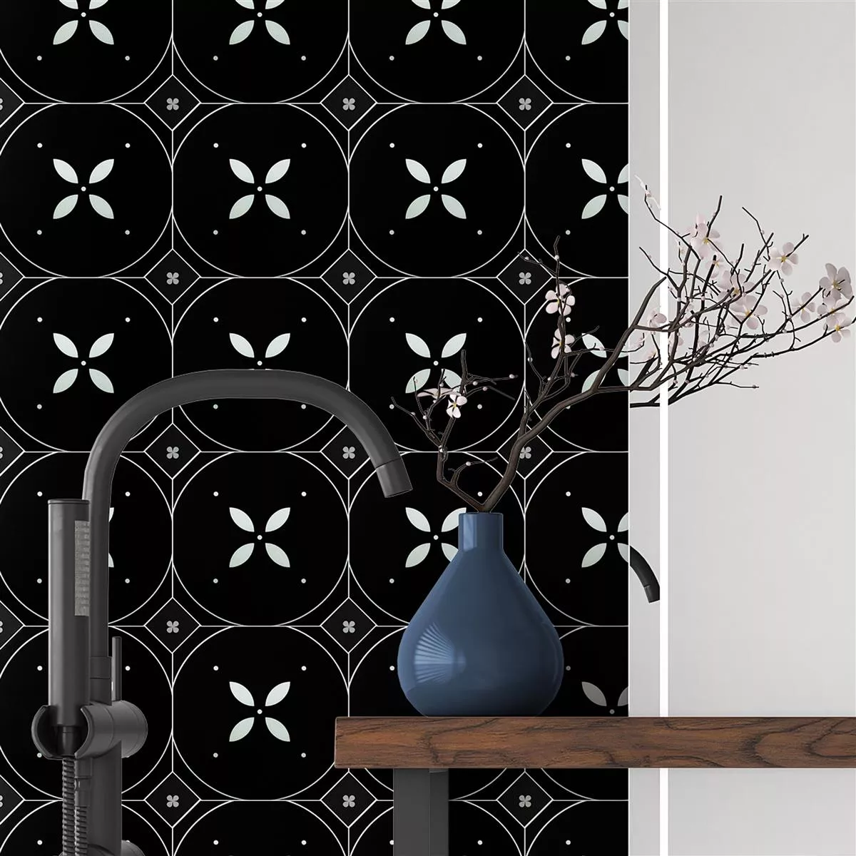 The Genexia Black White Decor 1 inlay porcelain stoneware tiles bring timeless elegance to any interior. The square format with a matte finish is suitable for both walls and floors, and its decorative black and white design will add a special touch to your rooms.