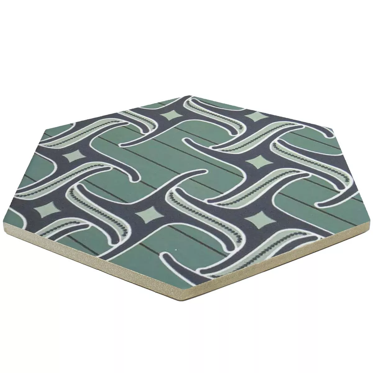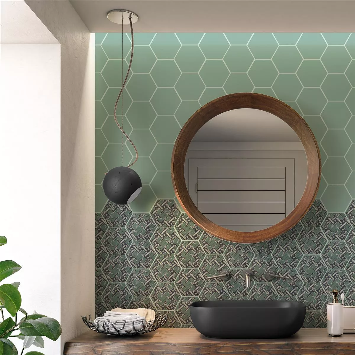 The “Modena Hexagon Decor 4” porcelain stoneware tiles are a work of art for your room. With a thickness of 10mm they are perfect for wet areas, showers, bathrooms, kitchens, living rooms and indoor areas. The matt surface and the ornamental motif in blue-green create a unique atmosphere.