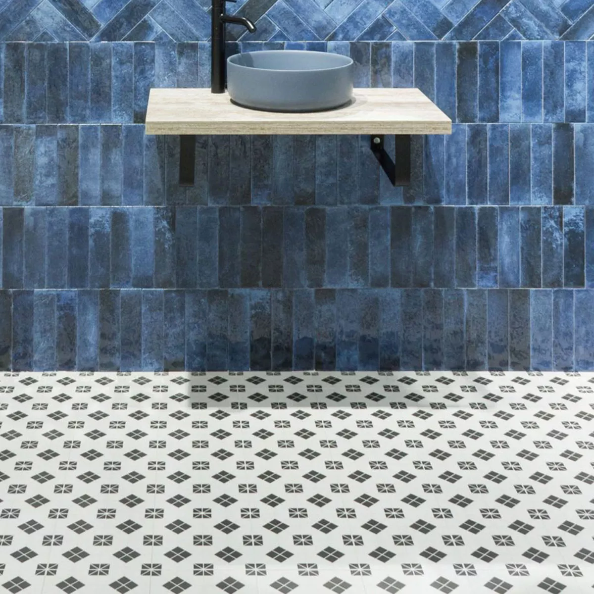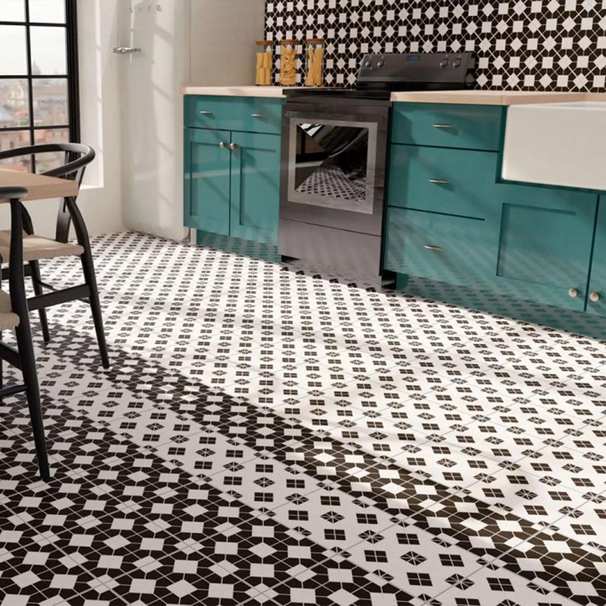 The Murcia 22.5x22.5cm white porcelain stoneware tiles give your interior a harmonious mix of black and white. The matt surface and a thickness of 9mm give them a robust structure.