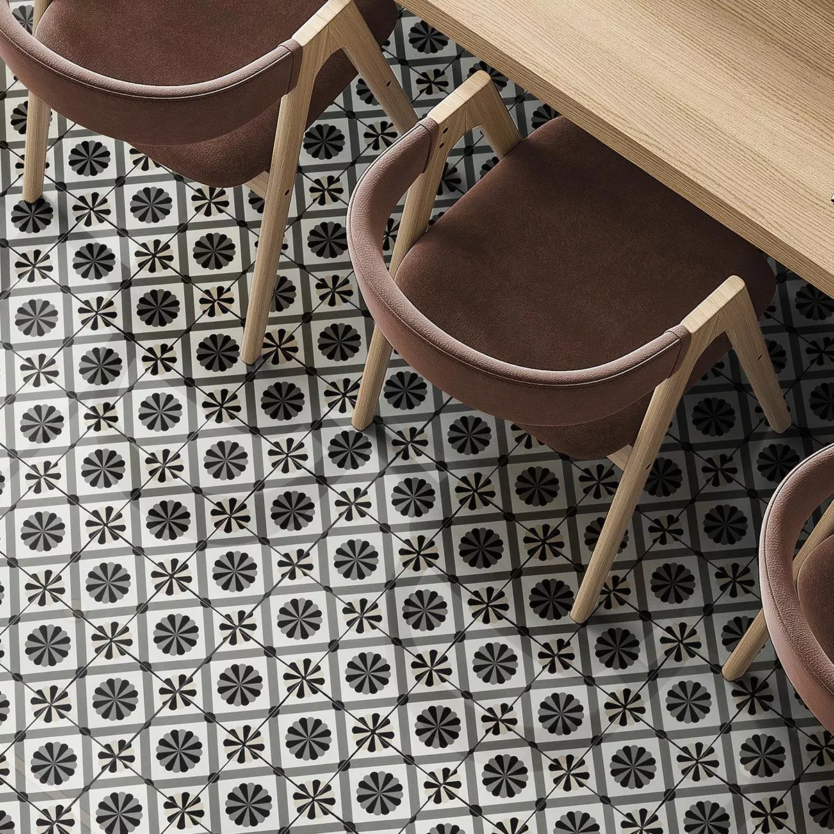 The timeless beauty of our Ornamenti Arezzo porcelain stoneware tiles. These square wall and floor tiles measuring 13.9x13.9cm give your interior an elegant floral look in grey, beige and white. The glazed, matt surface and a thickness of 8mm offer not only aesthetics but also durability.