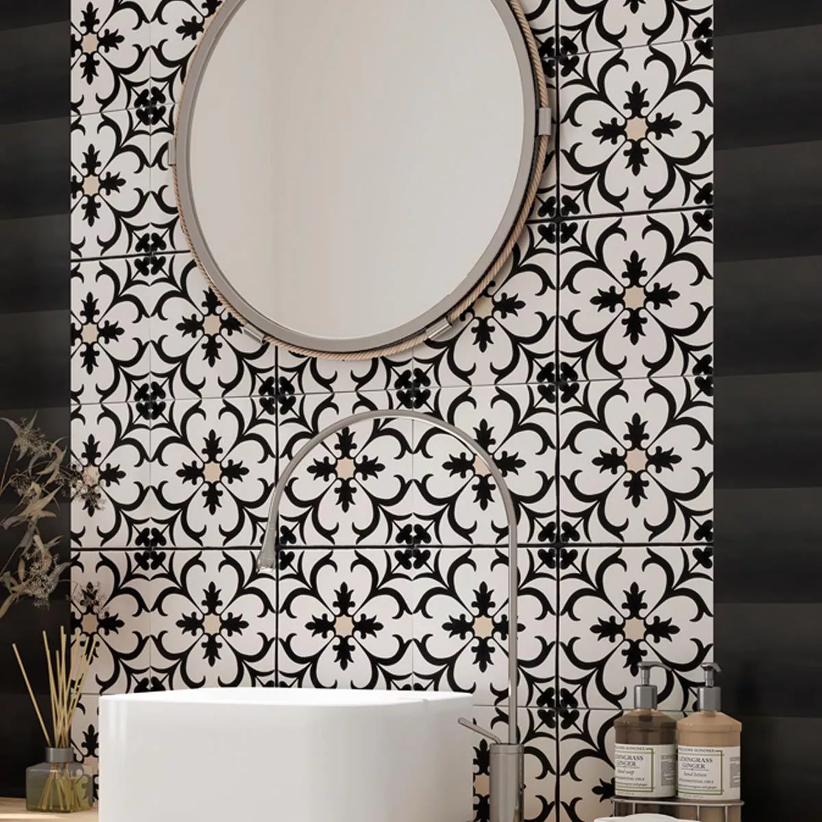 Immerse yourself in timeless elegance with our Ornamenti porcelain stoneware tiles in black. With their glazed surface and matt finish, they add a touch of sophistication and style to any room. Thanks to their underfloor heating capability, they offer not only comfort but also functionality in any interior space, be it the bathroom, kitchen, living room or even the shower.