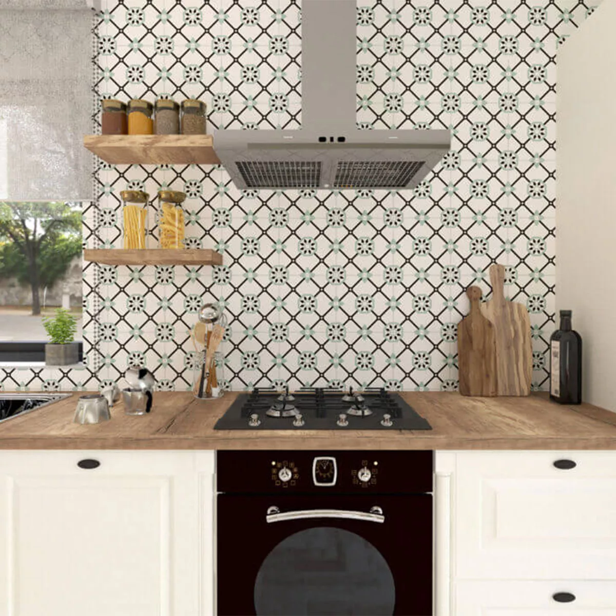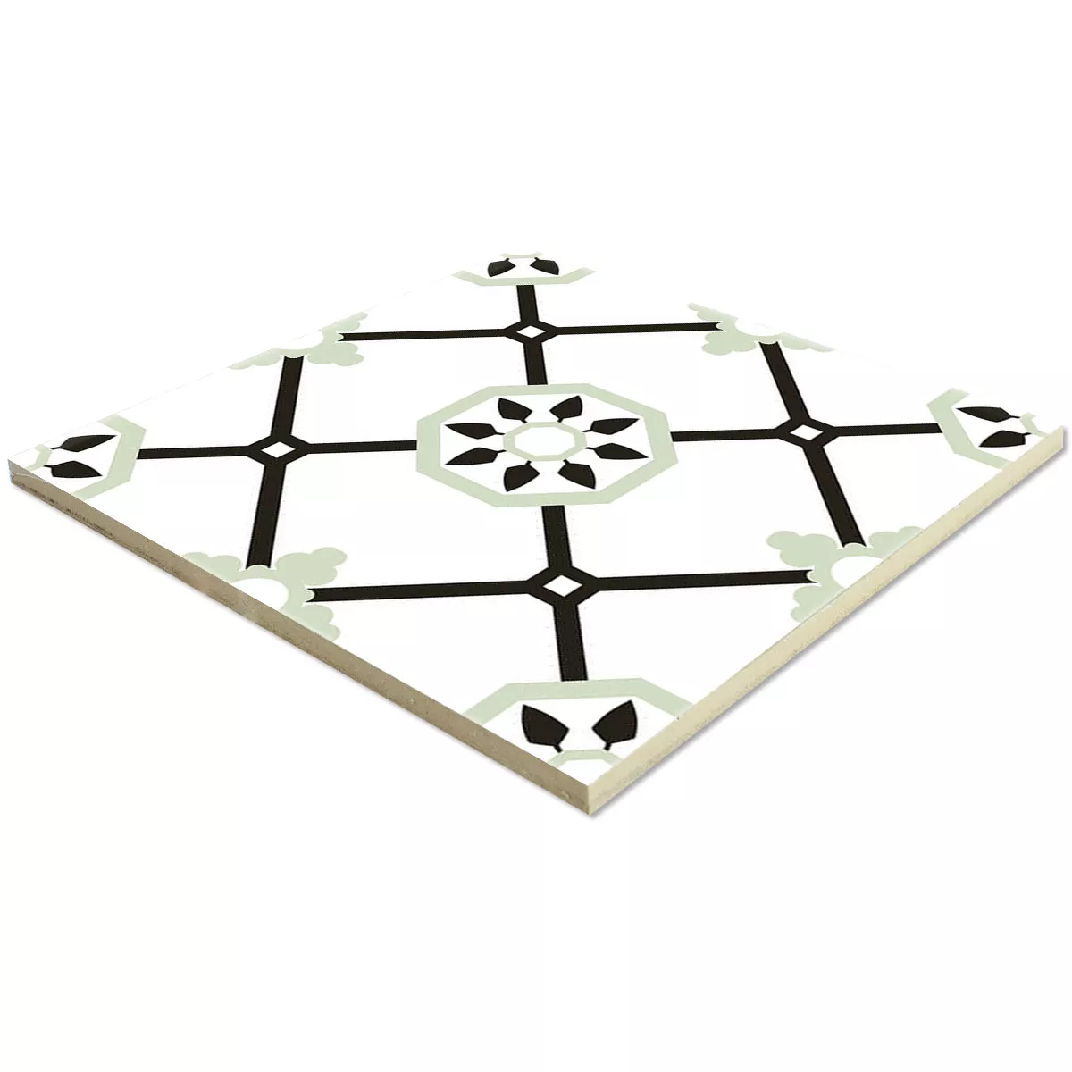 The square tiles measuring 22.5 x 22.5 cm and 9 mm thick impress with their attractive matt surface and the harmonious color combination of white and green. This timeless look brings both calm and style to your rooms.