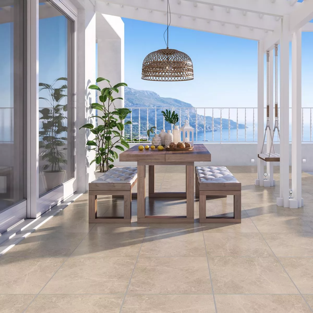 The Arizona Beige natural stone look porcelain stoneware patio tiles are ideal for designing outdoor areas such as patios, balconies and walkways. These tiles measure 60 x 60 cm and are 20 mm thick. One package contains two tiles and covers an area of 0.72 m².