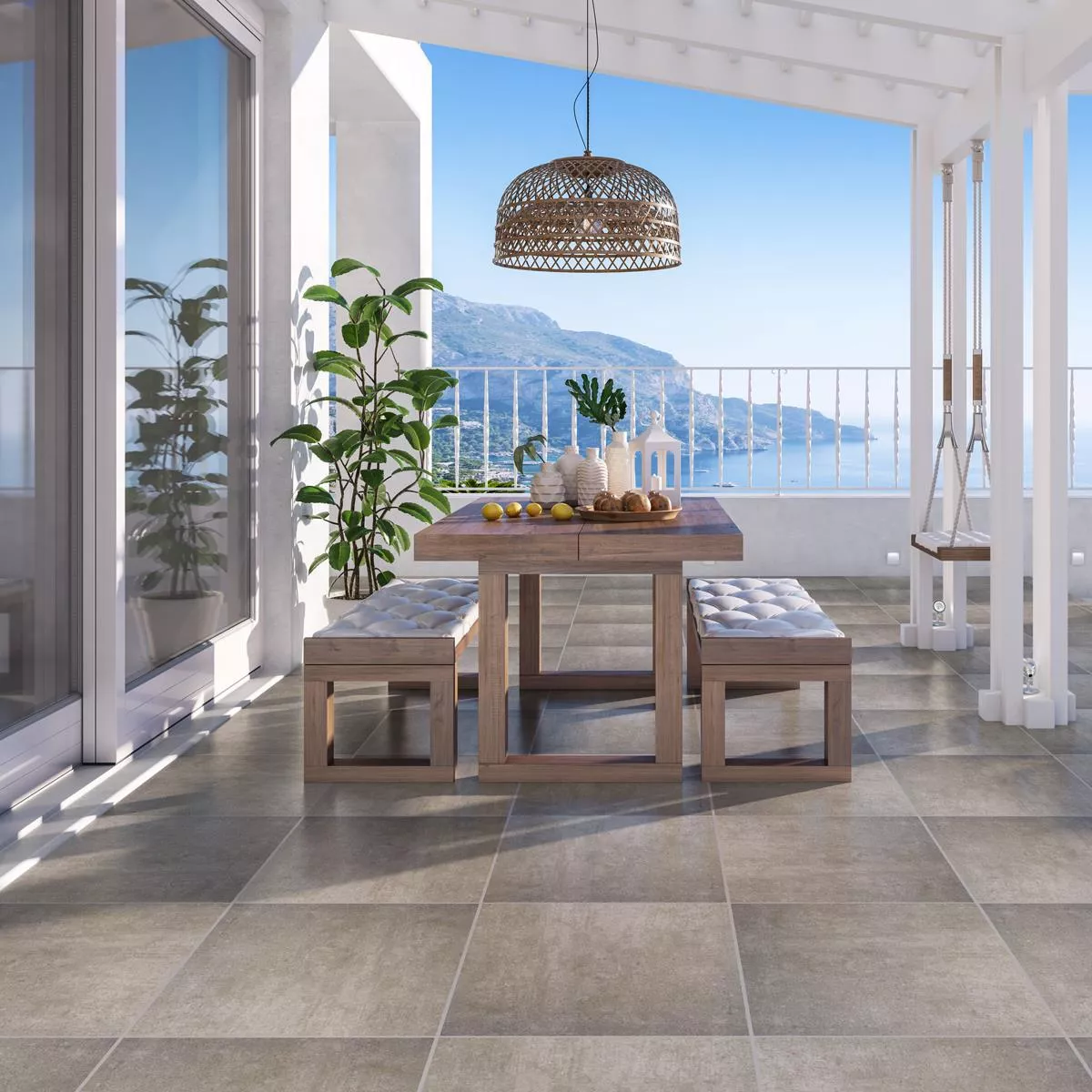 The Panama light grey 60x60x2 cm concrete look porcelain stoneware patio tiles offer a modern and durable solution for your outdoor areas. This square floor tile in light grey impresses with its authentic concrete look and a matt surface that gives it a contemporary look.