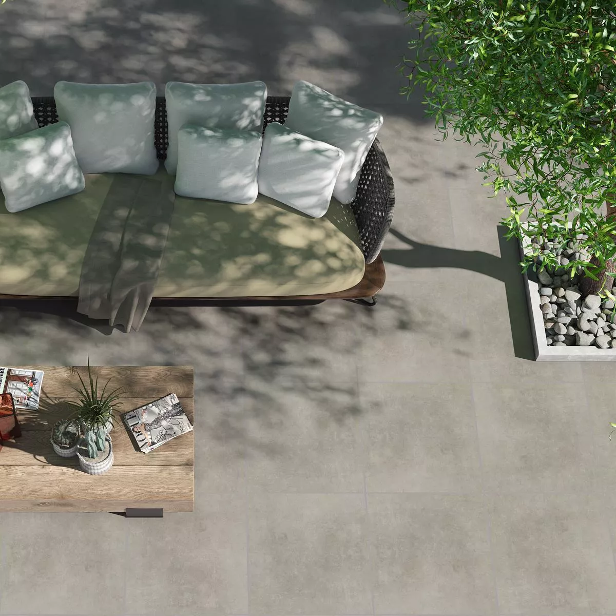 The light grey Petersburg porcelain stoneware patio tiles offer a modern concrete look and are ideal for indoor and outdoor use. Each tile measures 60x60 cm and is 20 mm thick, making it particularly robust and durable. One package covers 0.72 m² and contains two tiles.