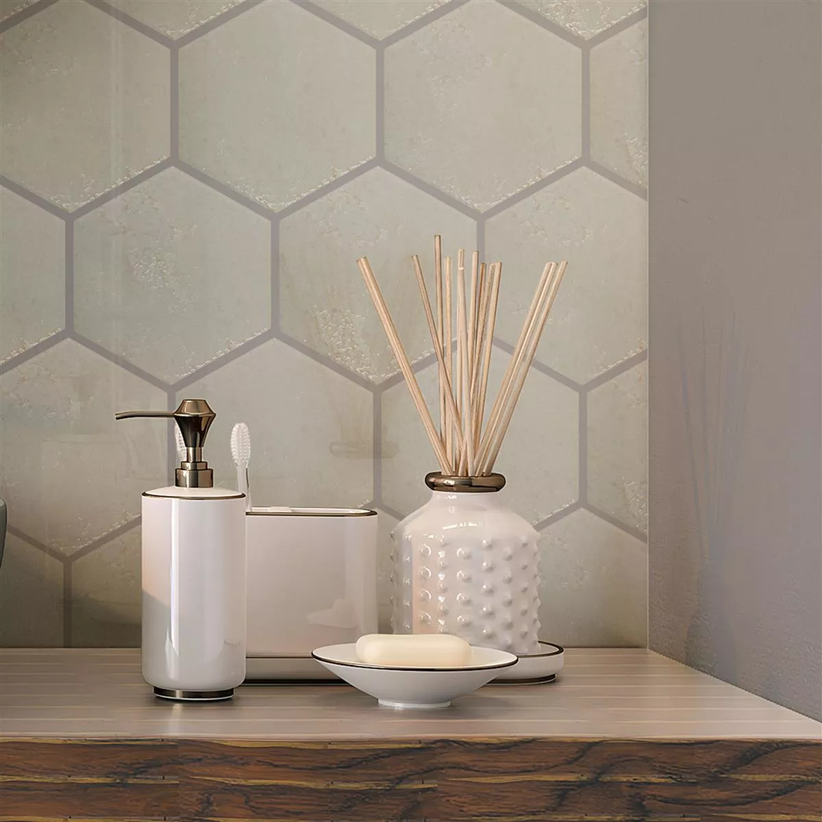 With a thickness of 7 mm, the tile is robust and ideal for use in various areas of your home - be it in the bathroom, shower, kitchen or living room. Its hexagonal format with a size of 13 x 15 cm gives any room a modern, geometric touch.